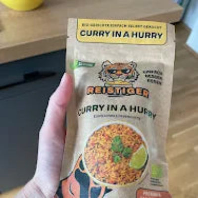 Die perfekte Mahlzeit, wenn’s mal schnell gehen muss. Sehr sättigend, mit tollen Nährwerten und extrem lecker obendrein. Ob als schnelles Mittagessen, leichtes Abendessen oder wenn nach dem Sport die Zeit zum Kochen fehlt – Reistiger ist dafür optimal. Ich habe das Probepaket getestet und muss sagen: Die Auswahl ist wirklich sehr gut. Mein Lieblingsgericht ist definitiv das Thai-Curry.