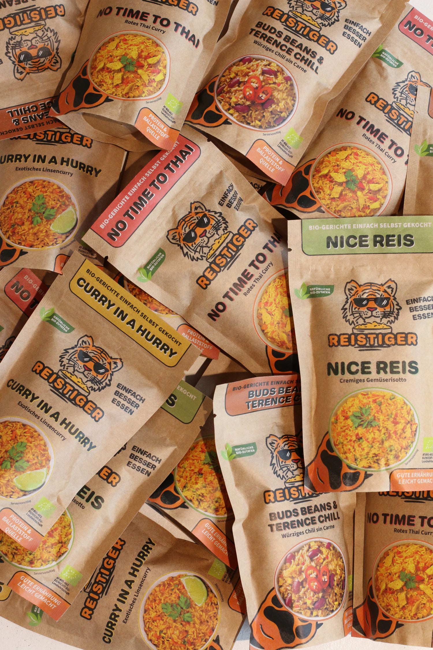 Mit anfangs noch selbst getrockneten Zutaten, unzähligen Versuchen und der Hilfe von guten Freunden entstand Reistiger. Bio-Reisgerichte, die mehr sind als nur schnelle Mahlzeiten. Sie sind die Antwort auf einen hektischen Lebensstil und dem Bedürfnis, sich selbst und unserem Planeten etwas Gutes zu tun.